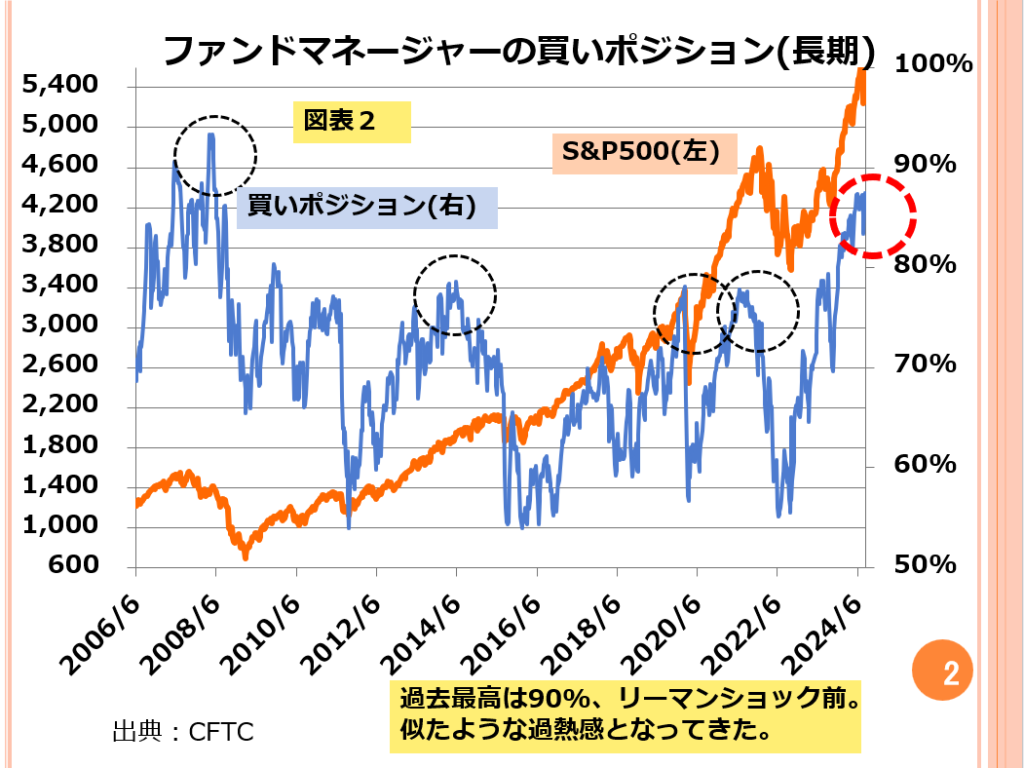 なお、87%は統計開始以来2番目に高いレベルです。これは図表2に見ればわかります。一番高かったのは、リーマンショック前につけた90%でした。当時は2003年からの株高で多くの人がそのメリットを享受していました。それが戦後最大の暴落・不況になってしまいました。同じようなことが起きるだろうと、ぼくは考えています。