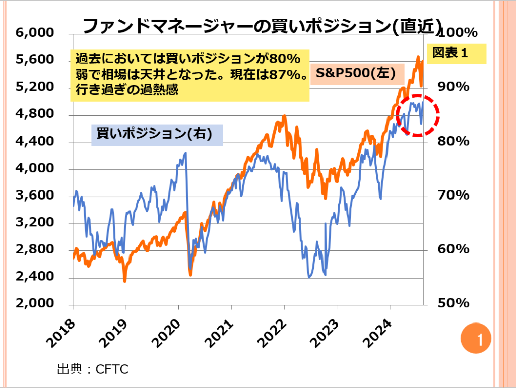 「NY株式市場の天井が近い」と判断する最大の理由は、ファンドマネージャーの買いポジションにあります。詳しく言うと、S&P500先物の買いポジションが87%に達しています。(逆に言えば、13%が売りポジションだということになります。)