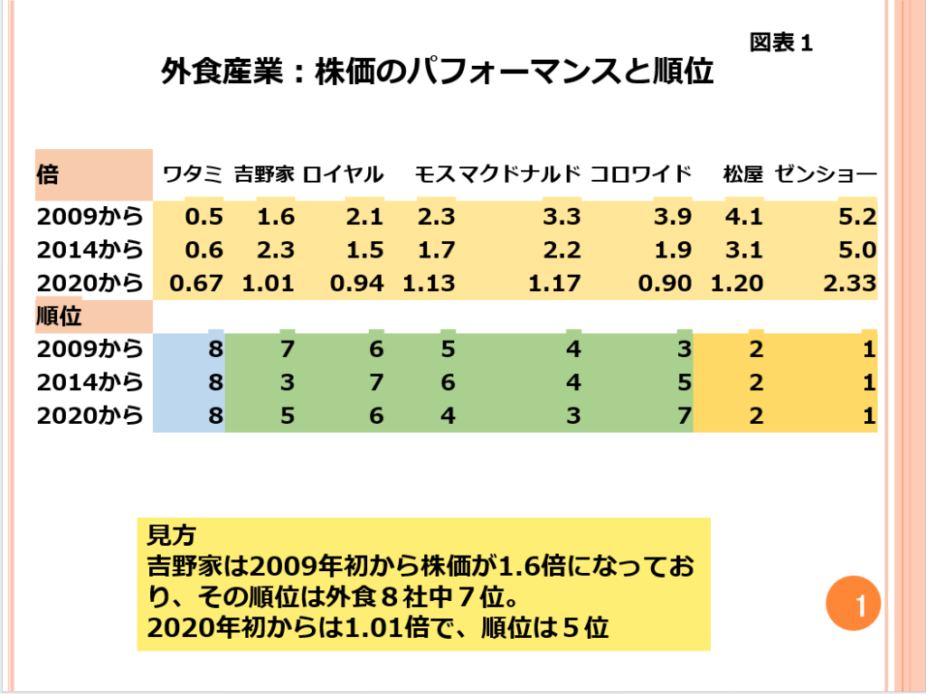 吉野家の株価パフォーマンスを外食大手7社(合計8社)と比較します。図表1です。2009年から現在までの株価パフォーマンスでは8社中7位、2020年からは8社中5位です。