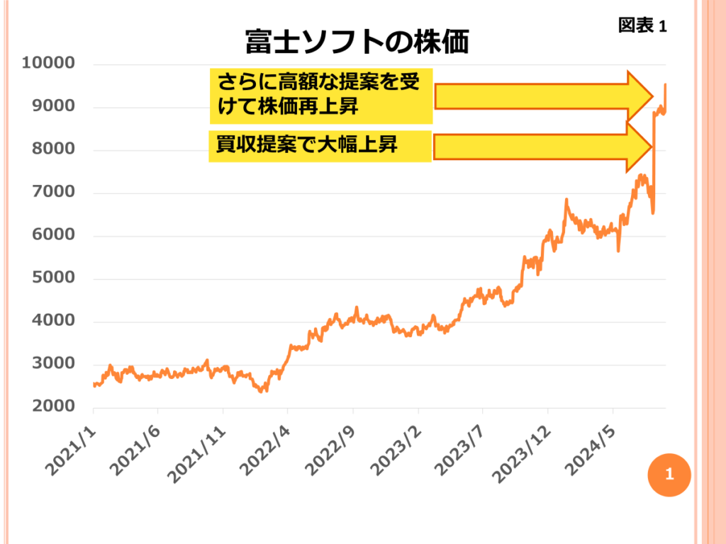 2024年8月に、アメリカの投資ファンド「KKR」が、およそ5600億円で富士ソフトを買収して非上場化させると発表し、会社側も賛同を表明していました。一株当たりでは約9000円です。株価もこの発表直後に急上昇しました。