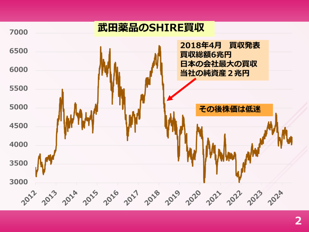 代表例は武田薬品のSHIRE社買収(2018年4月)です。日本史上最高額の買収金額で、2兆円の純資産の会社が6兆円の買収を実行しました。図表2にあるように、その後の武田薬品の株価は冴えません。当時の日経平均が22,000円程度だったことを考えると、株価パフィーマンスは劣悪だったと言えるでしょう。