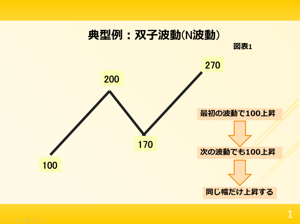 まず図表1を見てください。基本的な発想は双子波動です。N波動とも言います。Nという文字は、左側の棒と右側の縦棒とが同じ長さですね。(真ん中の斜めの棒も同じ長さですが、今日はこれは気にしないことにしましょう。)「最初の波動と次の波動が大体同じ長さになる」というのが、このN波動考え方です。2つの長さが同じになるので双子波動ともいいます。