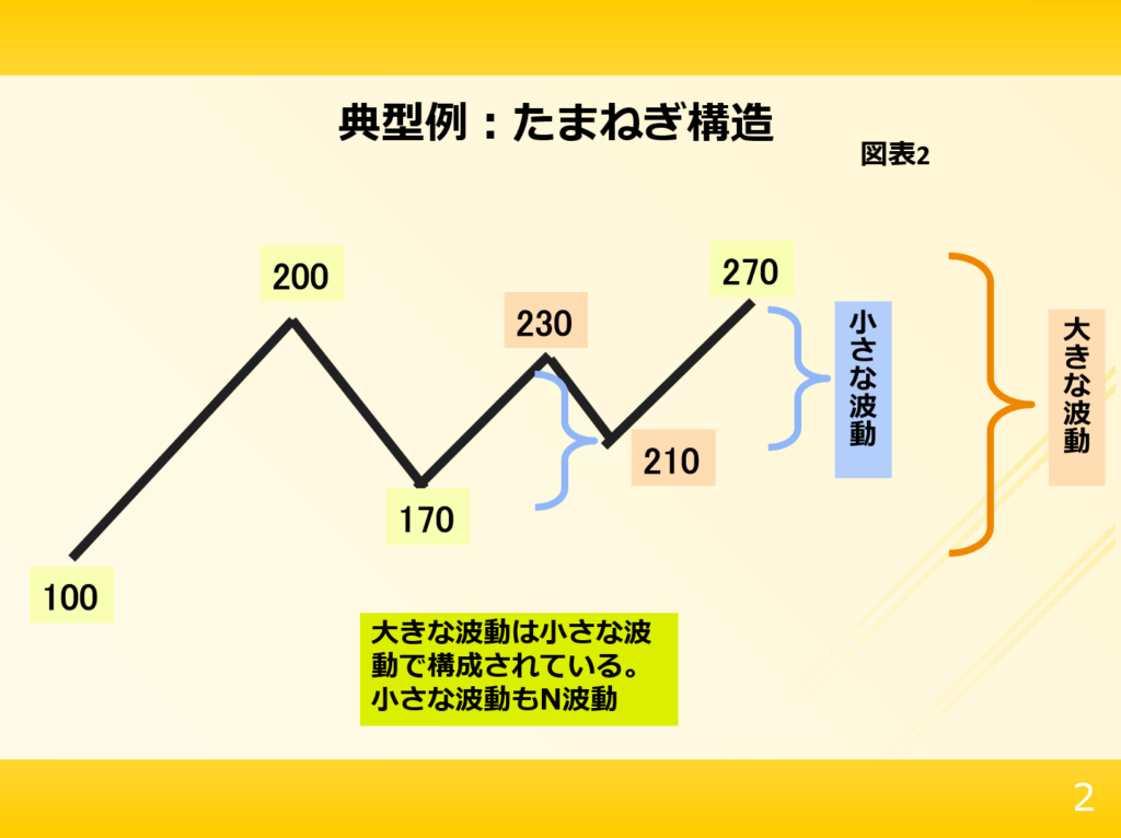 図表2にでは、この双子波動がたまねぎ構造をしていることを示しています。つまり、大きな波動は複数の小さな波動から成っているということです。図表1の例にあったように、最初の波動は100円から200円まで100円幅で上がりました。そこから30円下がって170円になりました。ここまでは同じです。
