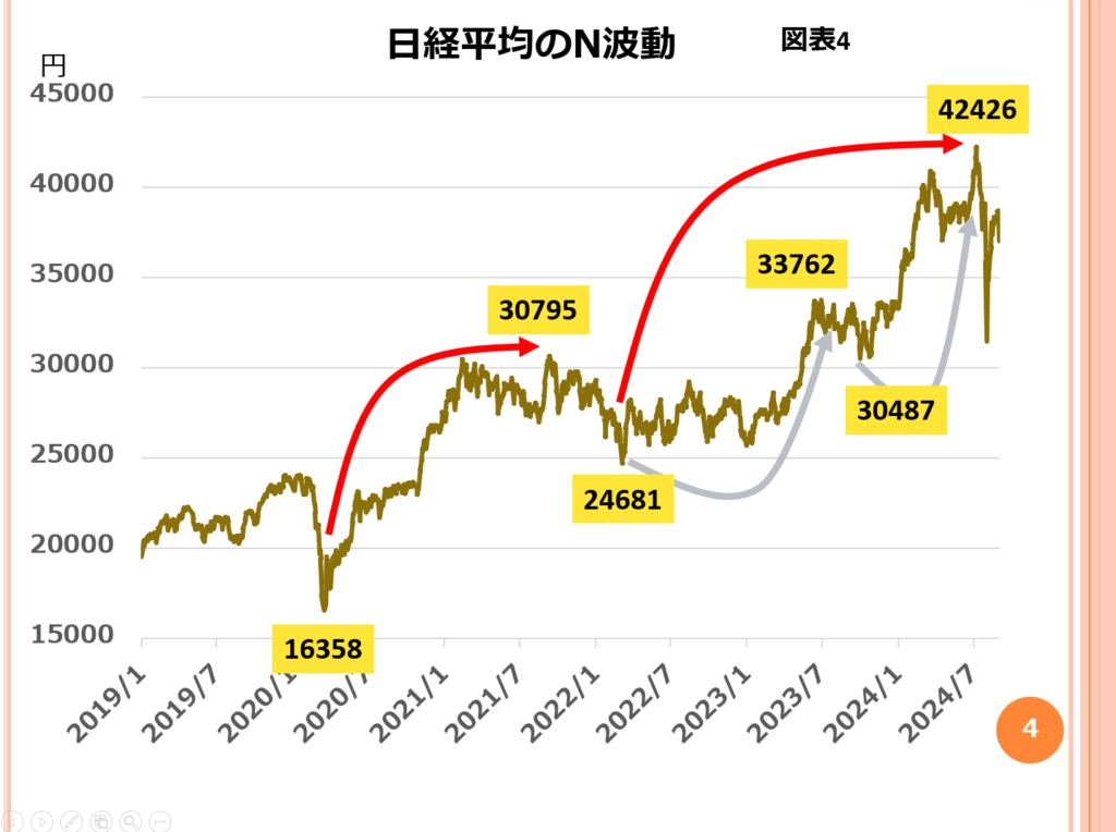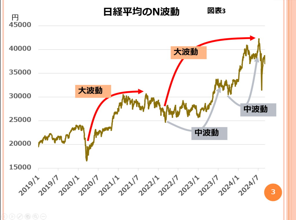 それでは、最近の日経平均見てみましょう。図表3です。2019年から最近までのチャートです。図に描かれているように、大きな波動と中波動の二つがあります。図表4には、高値と安値の値段をそれぞれ書き入れました。