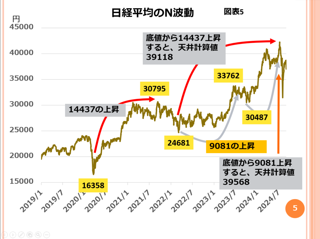 大きな波動で計算した値が39118円、中の波動で計算した値が39568円です。ここから、「日経平均が4万円弱で天井を打つだろう」と推察することになります。