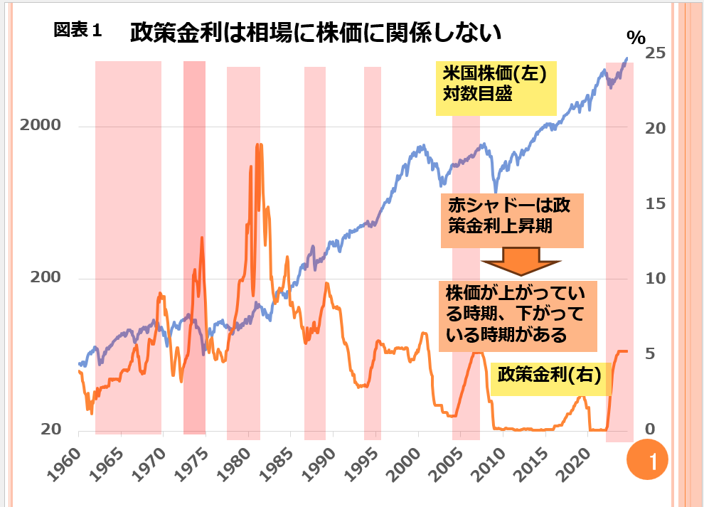その理由は、図表1を見れば、明確にわかります。図表1は米国株価(S&P500)と政策金利とが描かれています。赤いシャドーで示した時期が政策金利の上昇期です。