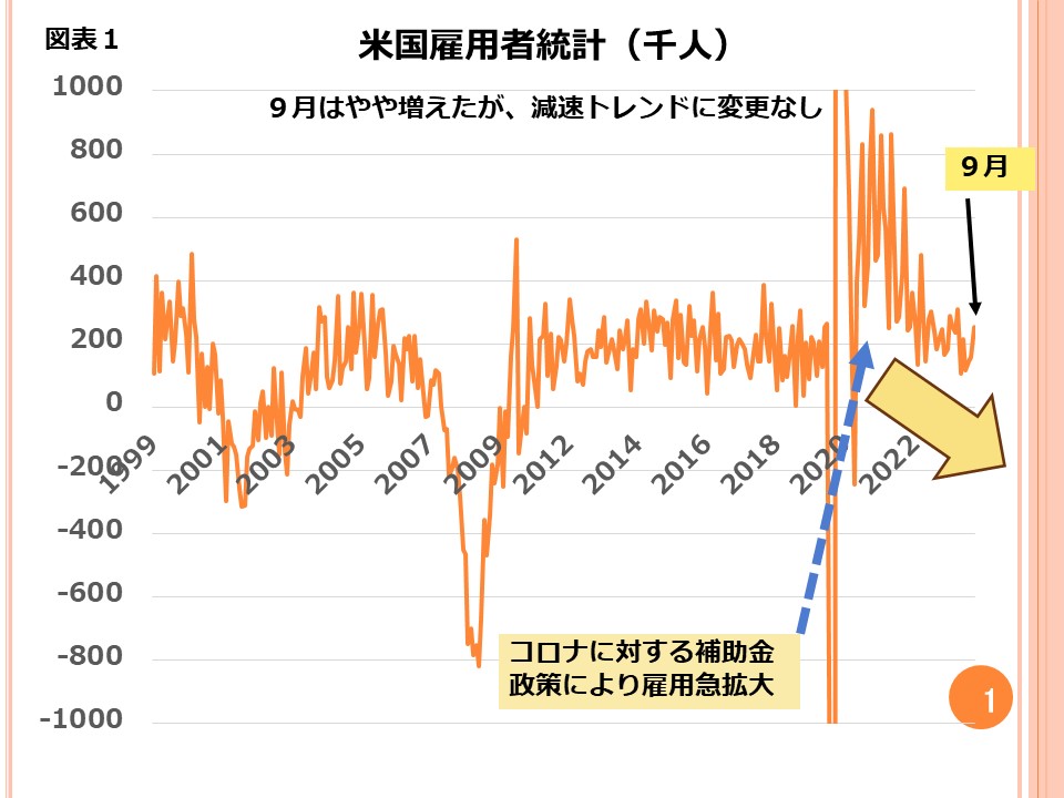 市場参加者の多くはこの雇用増を長期的な観点から見ていないからではないかと思います。コロナ収束以降、長期トレンドは「雇用される人数がしだいに減りつつある」というものです。図表1にその様子を示しました。