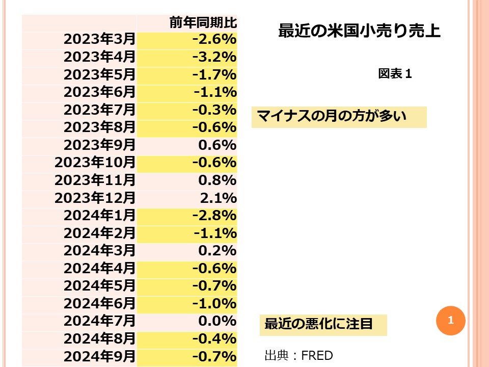 米国の消費が悪化している実態が統計で明らかになっています。9月の実質小売り売上が-0.7%となりました。実質とは名目の金額からインフレを除いた数値です。具体的には、7月0.0%、8月-0.4%と比較して、悪い数字になっているということです。