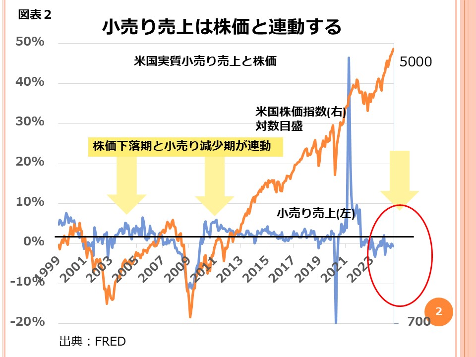 2000年をピークとしたITバブルの崩壊、2007年を株価のピークとしたリーマン・ショックへの崩壊を見ると、ピークの前後から実質小売売上がマイナスの領域に入っていることがわかります。