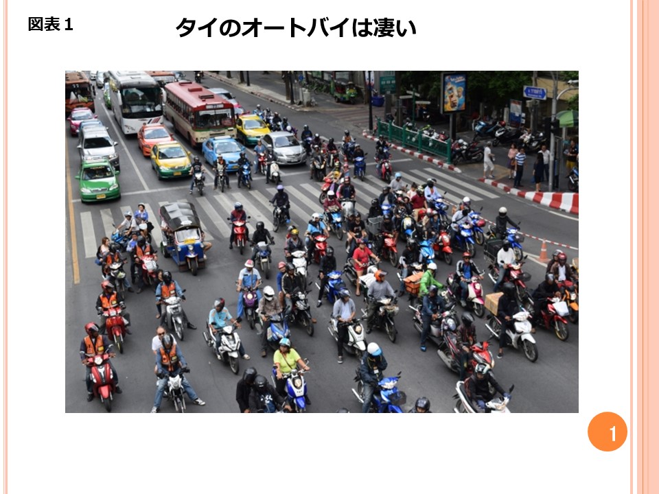 今日はぼくの住むタイのバンコクから、皆さんに興味深いお話をいたしましょう。オートバイの話です。図表1(写真)を見てください。非常に数多くのオートバイが走っていることがわかるでしょう。これがごく日常の風景です。