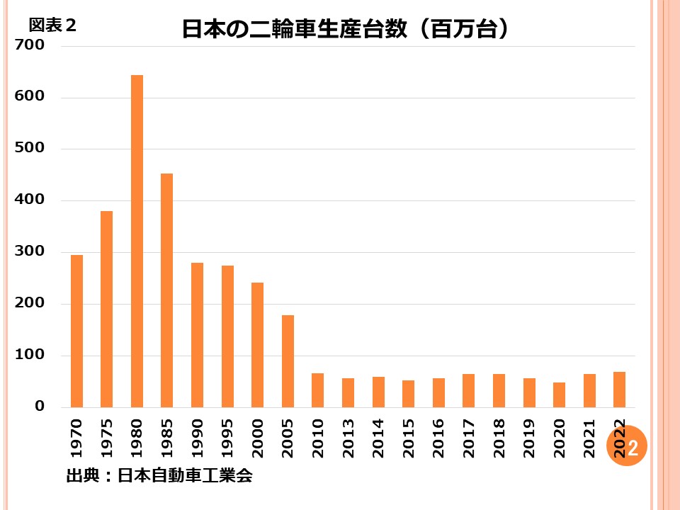 図表2にあるように、日本の二輪車生産台数は1980年には約650万台ありました。現状では、70万台を割っています。つまり、生産台数が10分の1に落ちています。