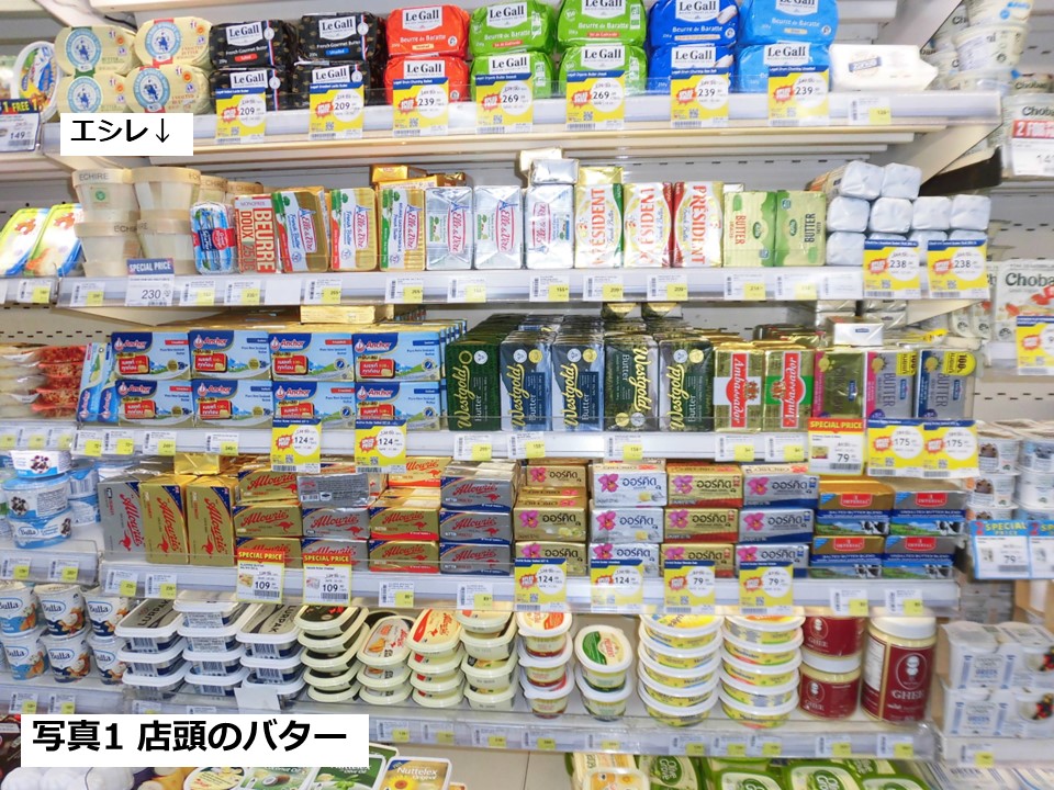 まず写真1を見てください。これが、バンコクのスーパーマーケットのバター売り場です。ぼくがこっそり撮りました。何か気づくことがありますか。海外生活をした人ならわかるのですが、これらのバターは輸入品です。タイ国内産は少ないです。これは日本のスーパーではあまり見られない光景です。日本のごく庶民的なスーパーを覗くと、日本製がほとんどだからです。