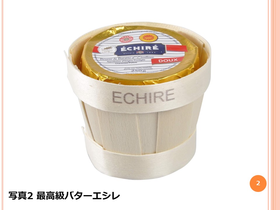 さて、ここで実際の価格を見てみましょう。日本で最も有名な海外産バターといえば、エシレです。フランス産の最高級のバターで、一流のフランス料理店で使われているものです。2008年日本でバター不足が起こった時のことです。このエシレも不足気味となり、あるフランス料理店のマネージャーは、「バター不足になってから、パンにたっぷりとエシレを塗るお客様が増えています」とこぼしていたことがありました。写真2が実物の写真で、250グラム入りです。