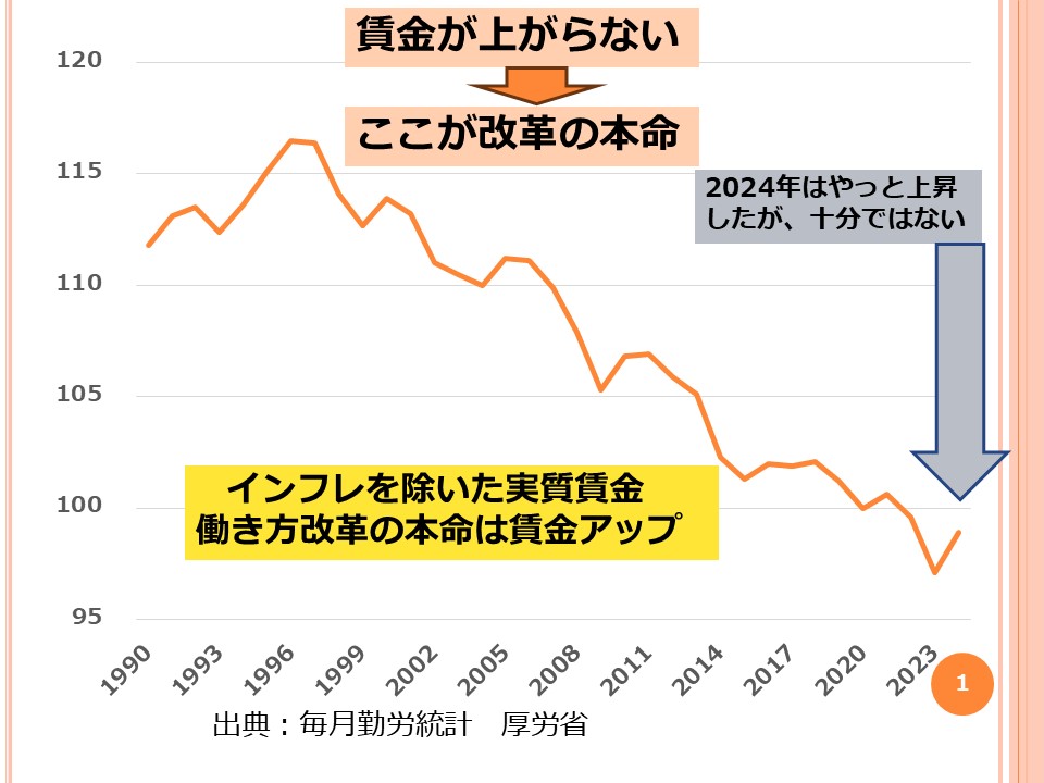 従業員が最も望むことは何か?それは給与が上がることです。図表1によれば、勤労者の給与実質賃金(インフレを考慮した賃金)は1996年をピーク(116.5)に、下がり続けています。2023年が最も低く、97.1まで下がってしまいました。ピークからの下げ幅で17%です。今年は、やや復活しているものの、98.9で、前年から2%弱の上昇です。大きな回復とは言えません。