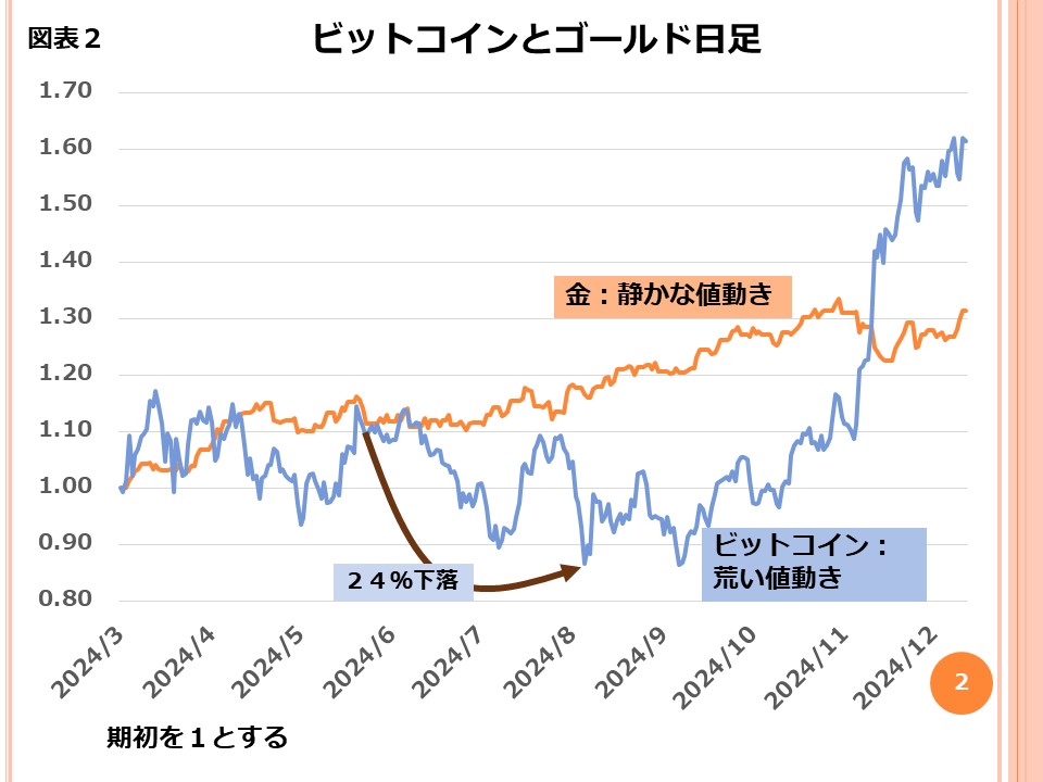 これに対して、ゴールドにはそのような大きな上がり下がりは生じていません。これは図表2を見れば明らかです。ビットコインは今年に入っても24%の下落を起こしています。