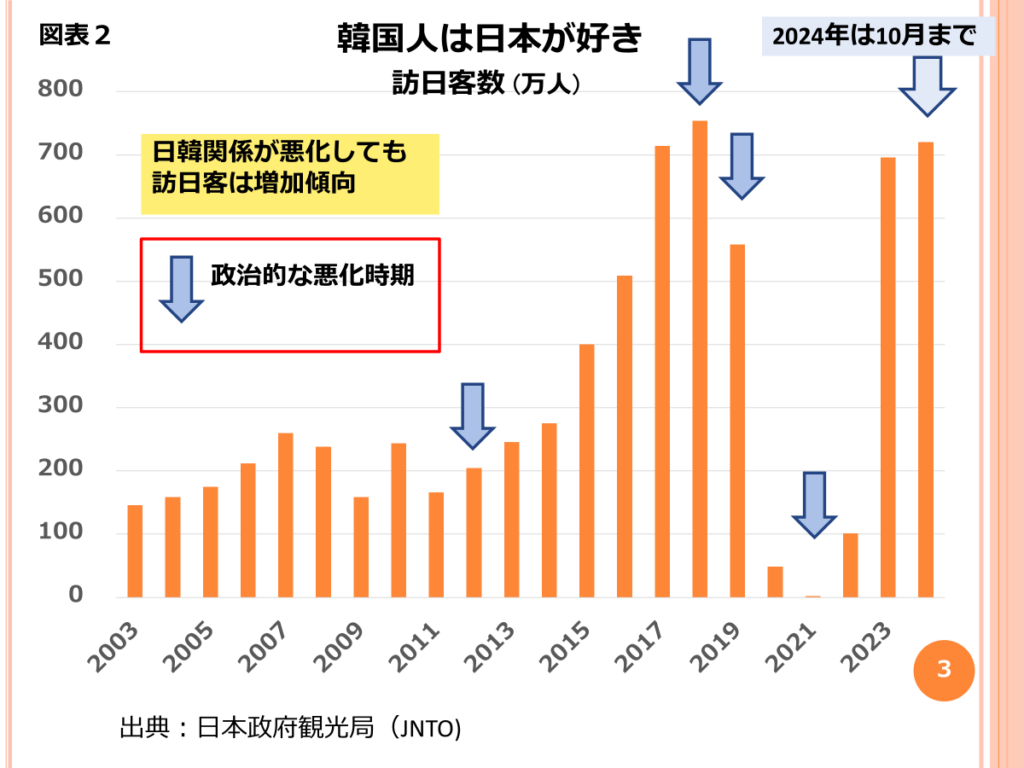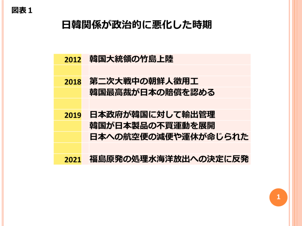 政治的に日韓関係が悪化した時期は2012年、2018年、2019年、2021年とありました。具体的な内容は図表に記しましたのでここでは省略します。