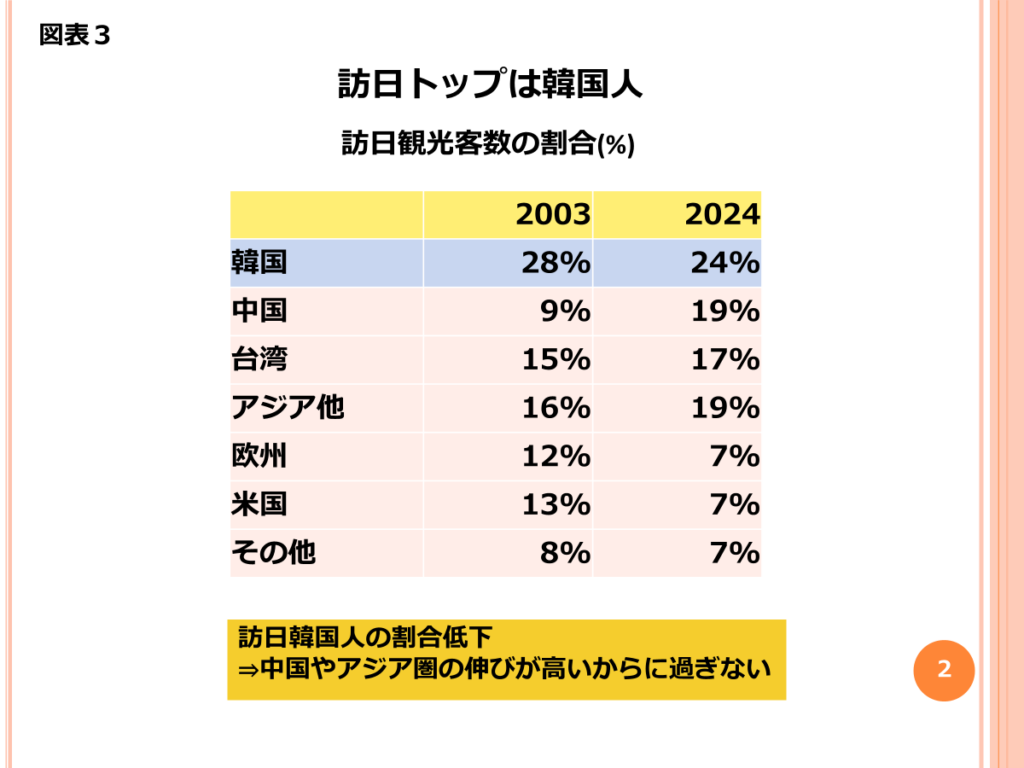 韓国の4ポイント低下の理由は、主に他のアジア諸国(中国・台湾・タイ・ベトナムといった国々)からの訪日観光客が増えているからであって、韓国人の日本熱が下がっているわけではありません。