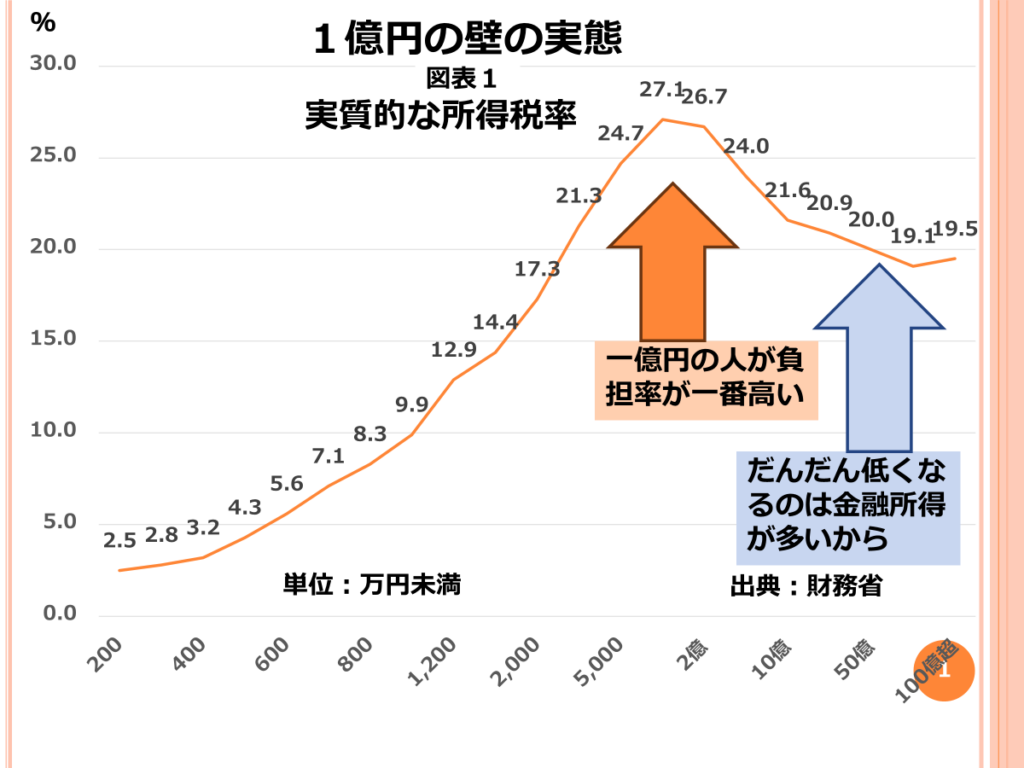 国民民主党が問題視しているのは、「1億円の壁」です。政府関係者や役人たちは、「収入が多い人ほど、納税額が多いだけでなく、納税率が高くあるべきだ」と考えています。ところが、現実を見ると、収入が1億円を超えると納税率が下がっていきます。