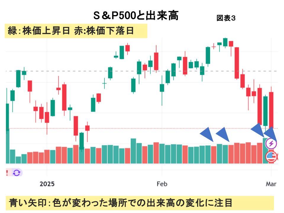 この出来高の中で色が変わるところ(緑→赤、赤→緑)に注目してください。
