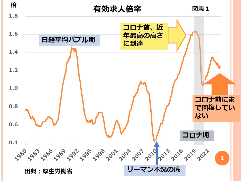 その後、日経平均が持ち直して2万円台になって、有効求人倍率も過去最高の1.6にまで上がったのです。それはコロナ発生前のことでした。しかしコロナ禍に入ると、有効求人倍率は一気に落ちました。そしてアフター・コロナへ移行すると、やや回復し、現状は1.3レベルになっています。