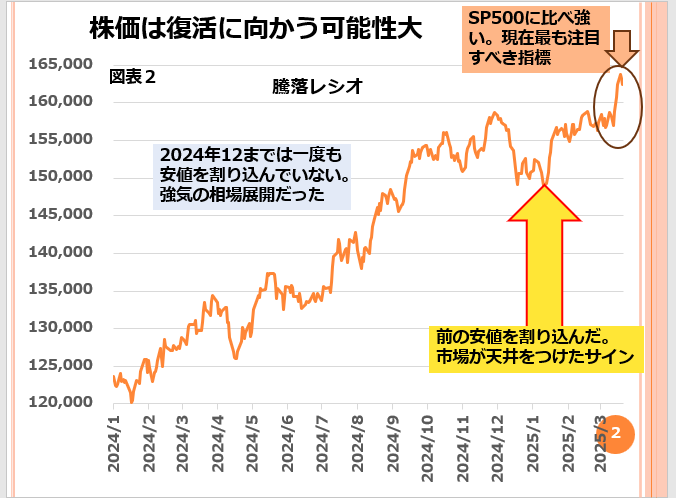 しかし、図表2に見るように騰落レシオはダウとは全く別の形を示しています。上昇基調です。