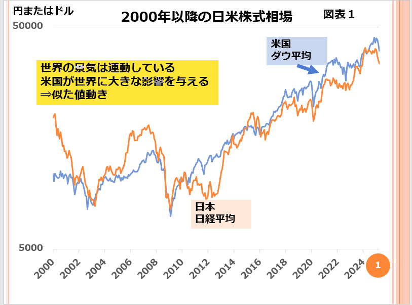 この動きを見てわかるのは、概ね日米株価が連動していることです。