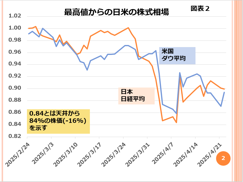 これを見ると、日経平均が高値から直近の安値まで84%にまで下がり、ダウ平均が86%にまで下がっています。