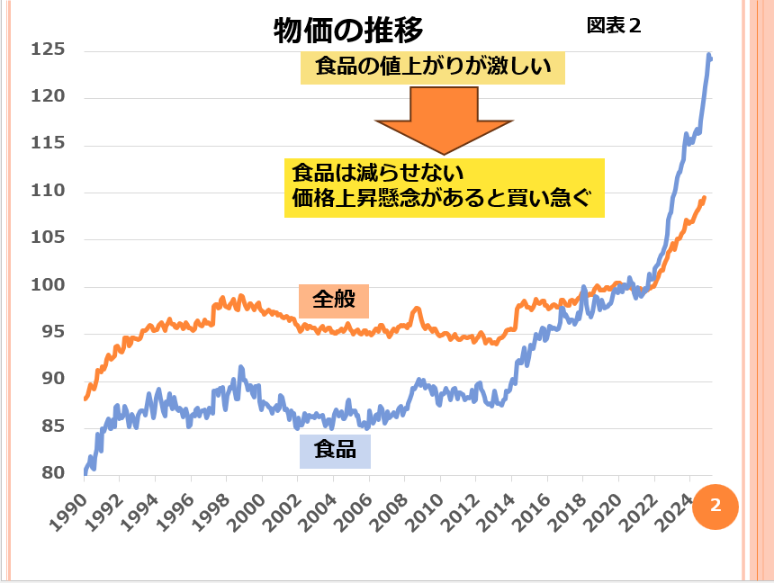 図表2を見ると、米価格ほどではないですが、食品価格も大きく上がっています。