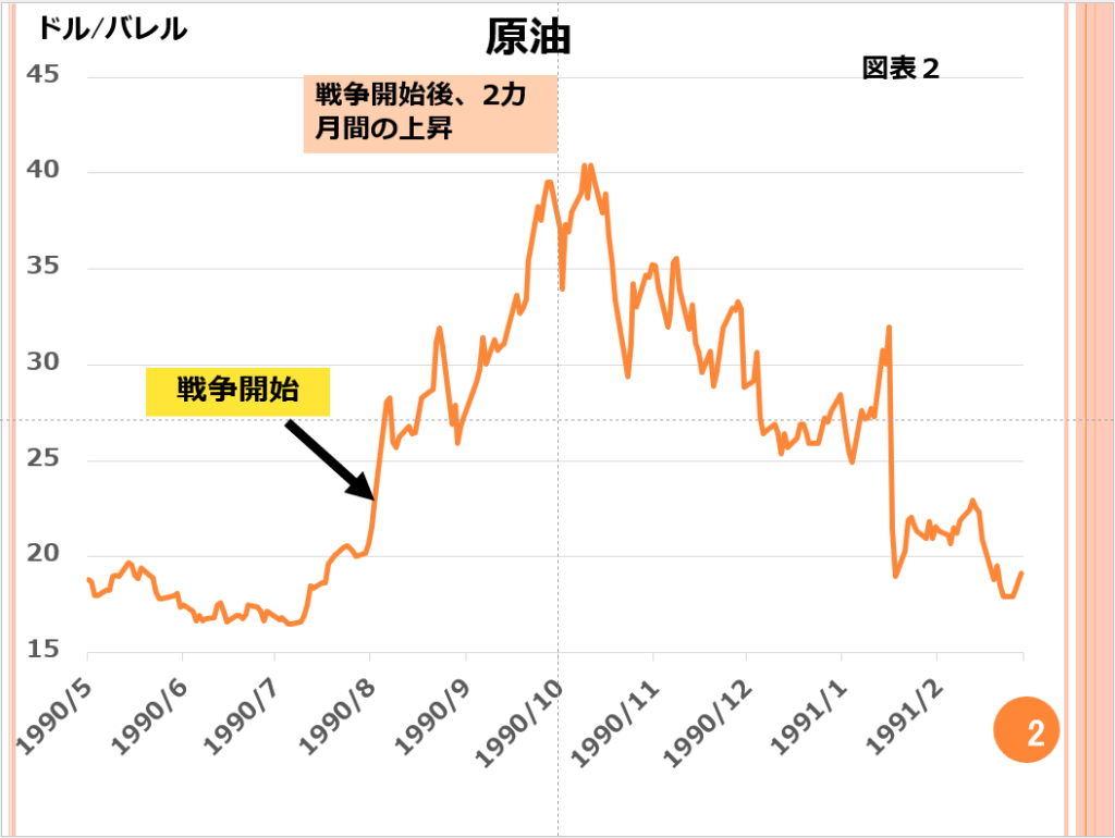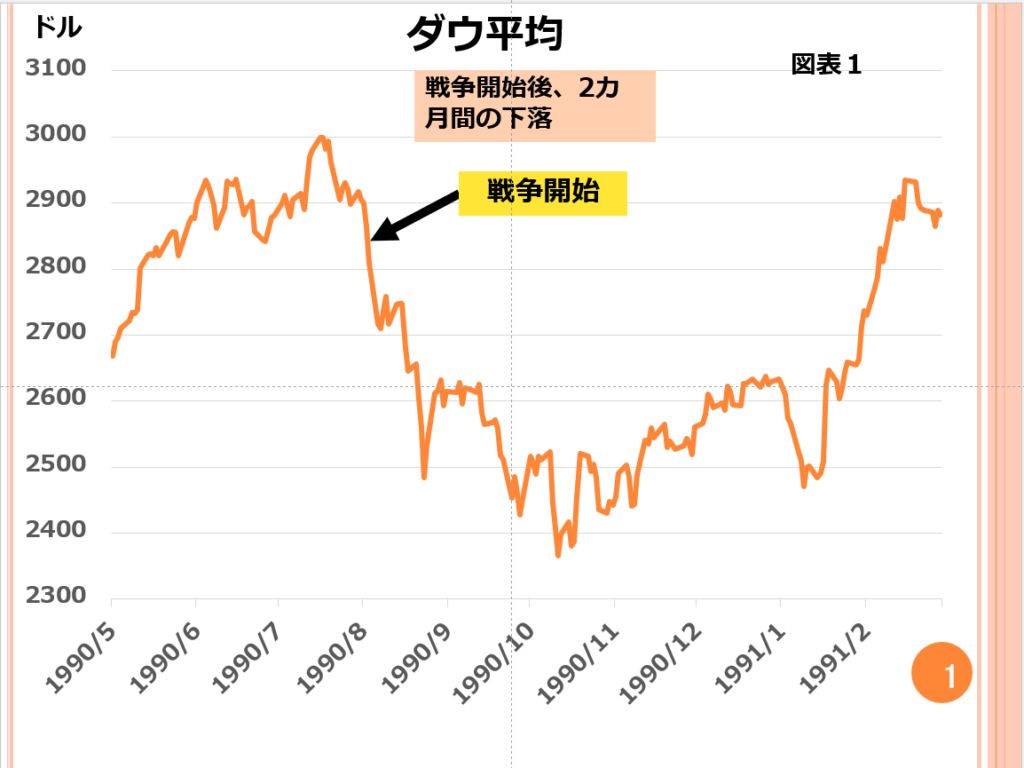 図表1を見ると、湾岸戦争が開始された1990年8月2日から株価が大きく下げているのがわかります。