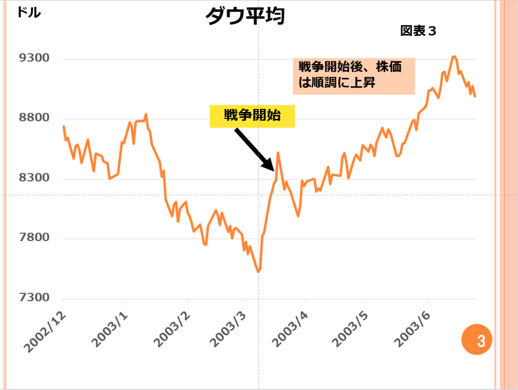 イラク戦争がいい事例です。2003年3月20日の開始です。図表3に、ダウ平均の動きを見ると、戦争開始後に大きく上がっているのがわかります。