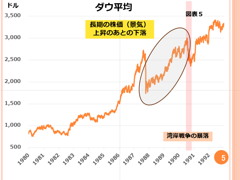 1990年に入り、景気がピークを打ち、それが原因で株価が下がったというのが真相です。戦争開始は株価下落のきっかけになったに過ぎません。