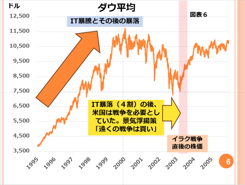 また、イラク戦争は、IT暴落で株価が4割超下げた後に起きました。IT暴落、不景気からの回復のために、米国は戦争を必要としていたのです。景気浮揚策です。狙いが見事あたり、景気は回復基調になり、株価は底入れしました。図表6です。