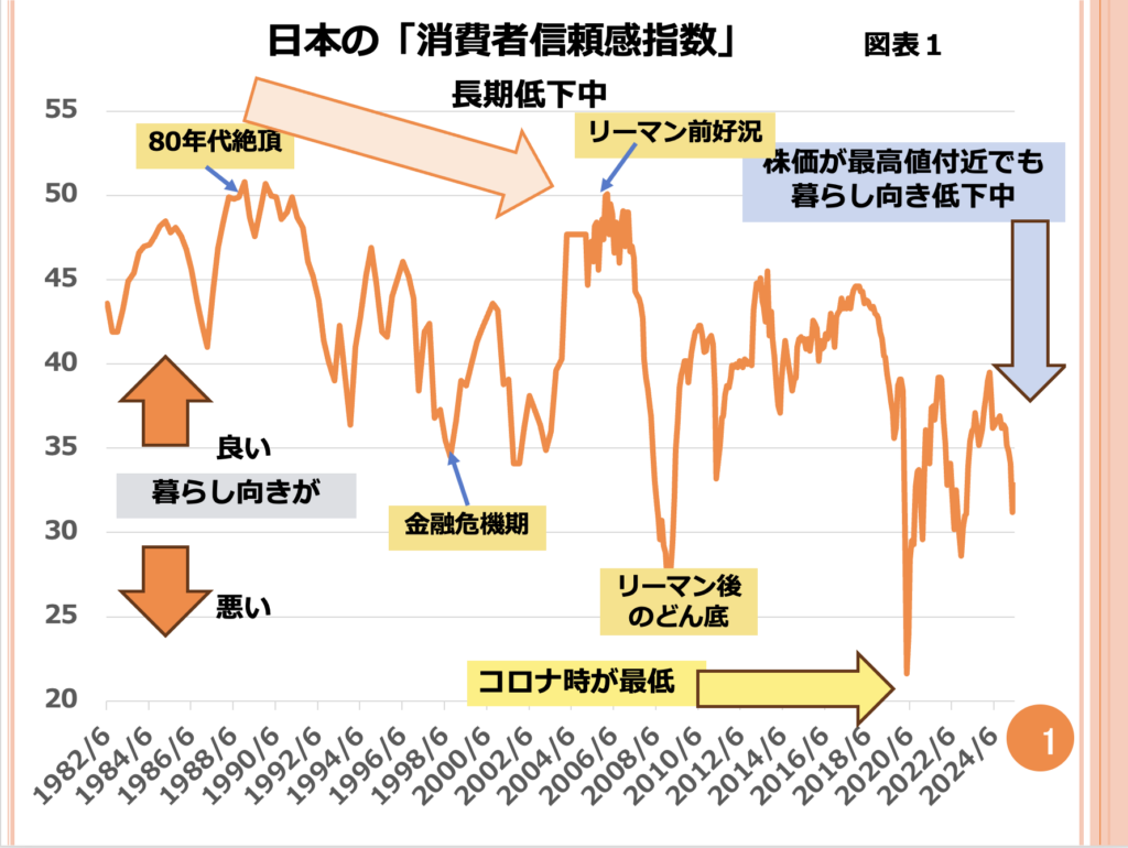 現在、日経平均は現在4万円を超え、人々はその高さに浮かれ始めていますが、信頼感指数は33まで低下しています。「暮らし向きが良くなっている」と感じている人たちが少ないからです。