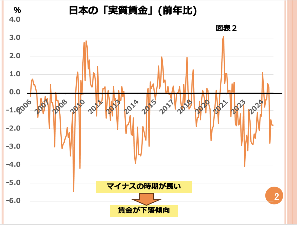図表2を見ると、2000年からの実質賃金前年同期比の中でマイナスの期間が長いことに気づきます。