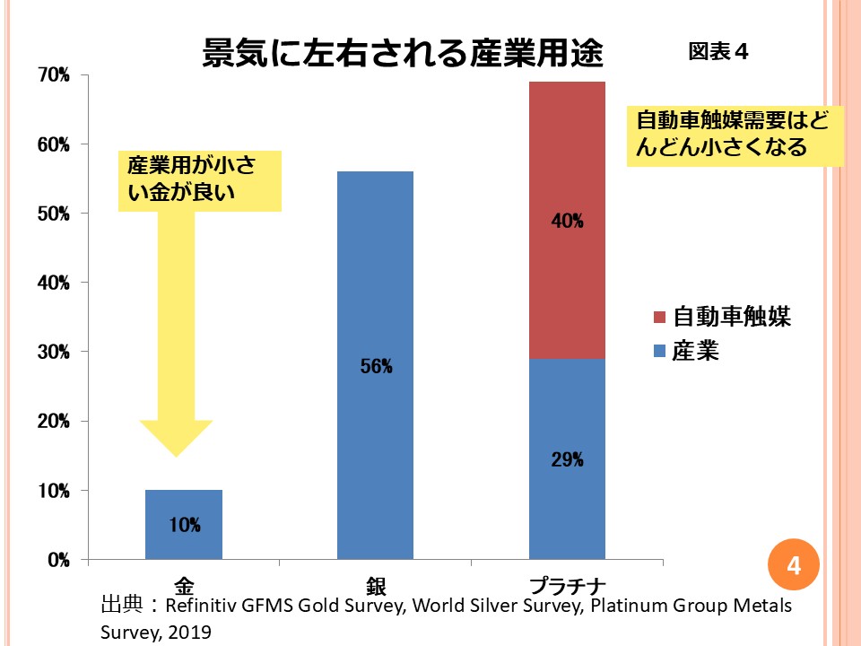 今後、プラチナがゴールドほどには上がらないと考えられる理由は、プラチナの主な需要が産業用途だからです。