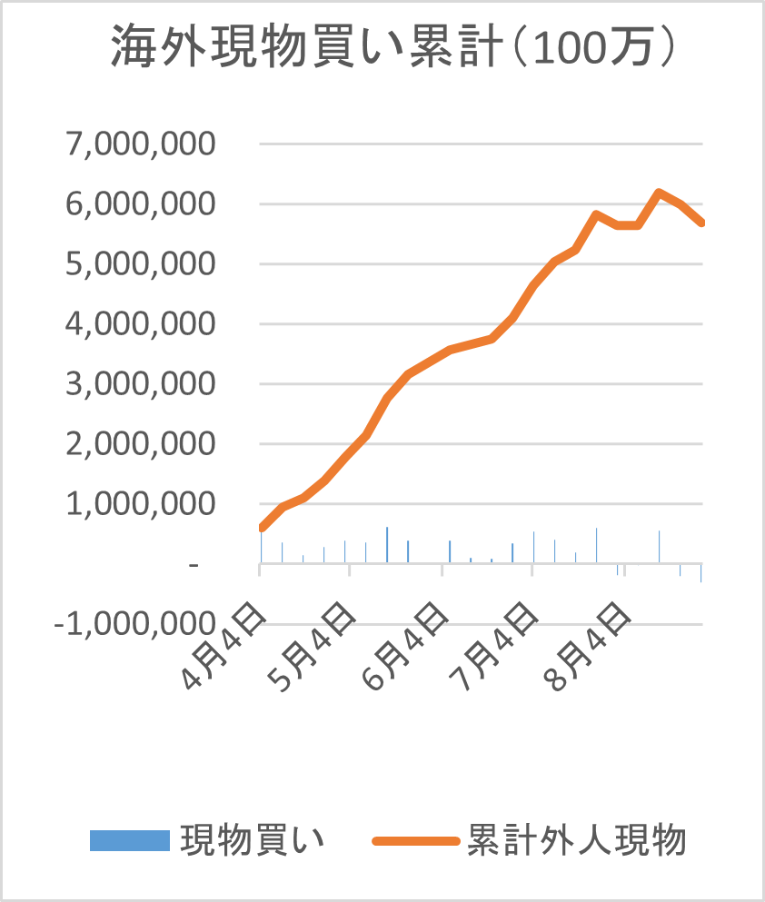 に転じ、海外投資家が買い続けて、買い越し額の昨年ピークの60%弱にまで戻っ